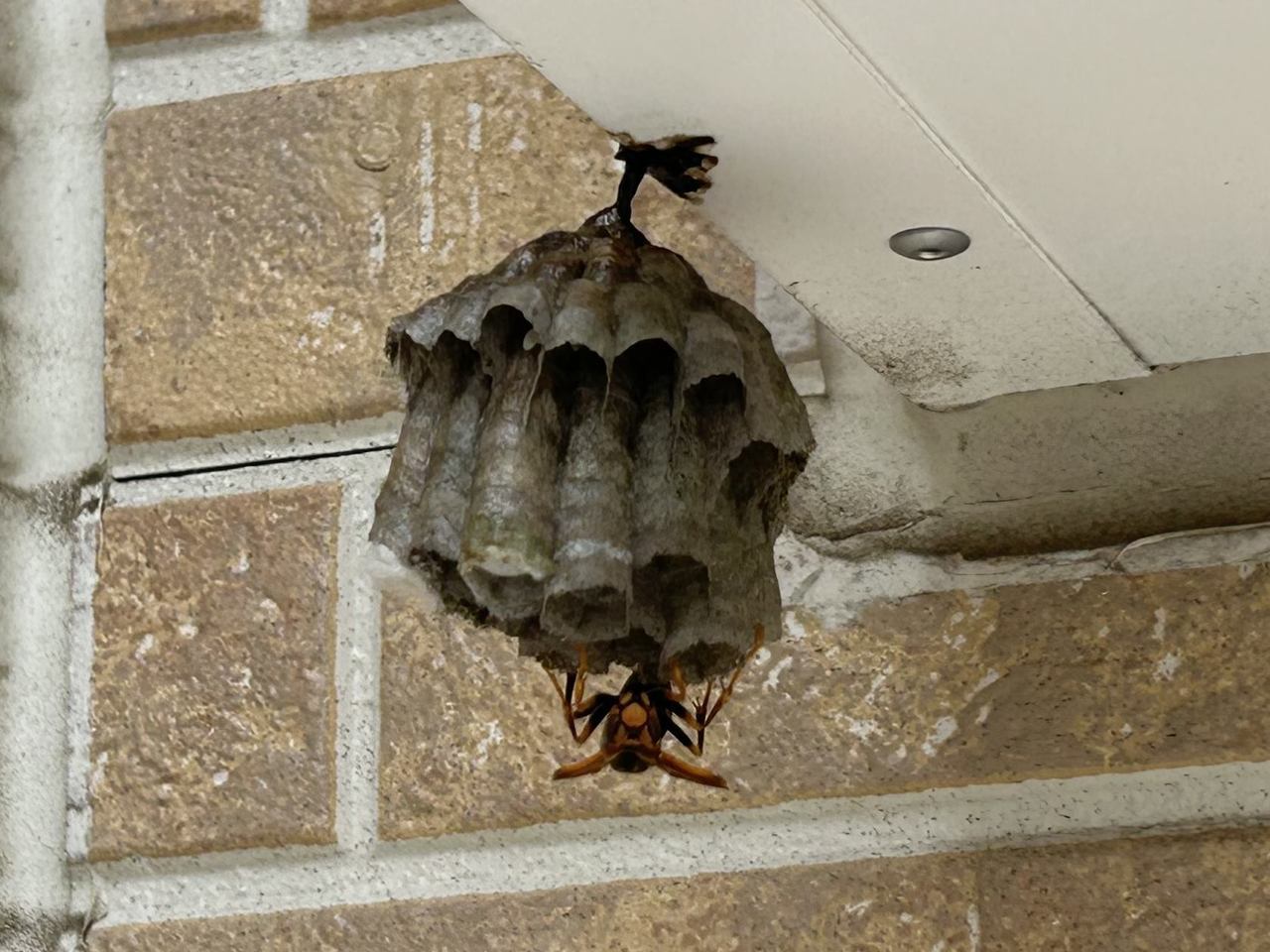 巣の外側には、常に沢山の成虫がくっついてうろうろします。とても攻撃性が高く神経質であるため、巣に近づくだけで警戒して中からどんどん出てきて人を刺します。