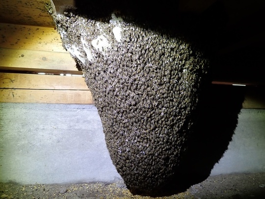 こちらの現場となったお客様は、ミツバチの分蜂の事もよくご存知で、しばらく放っておけばいなくなるだろうとお考えになりました。数日経ってもいなくならないので、私にご依頼くださりましたが、こういった閉鎖空間ではない場所にもミツバチは巣を作る事があります。少しでも不安な場合は私にご連絡ください。ご相談のみでももちろん承ります。