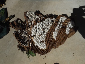 あらかた蜂を駆除した後で巣を取りだしました。手が入らないくらい小さな穴から出入りしていたので、お客様にご了承いただきチェンソーでのカットをいたしました。10月ですのでさすがに大きな巣がでてきました。
