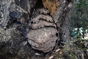取り出した蜂の巣。取り出してできた木の空洞部分は土や網を使用して埋めました。翌年以降にまた巣を作られないようにするためです。